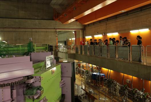 当天下午,Motobayashi教授介绍了日本理化学研究所放射性束流装置的基本概况以及RIKEN在放射性核束物理方面取得的重要成就。随后,在他教授的带领下,学员们参观了位于地下的放射性束流装置(RIBF)。RIBF使用变频重离子直线加速器作为离子源,离子在经过包括世界上最大的超导环形加速器SRC在内的5个环形加速器加速后,经由超导直线同位素分离器,产生高能放射性离子束,是世界上规模最大、能量最高的环形离子加速器之一。