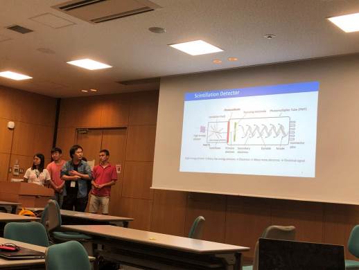 之后几天,学员们收听了来自三个学校的带队老师以及仁科中心的多位研究员教授的讲座,内容涵盖了粒子物理与核物理基础知识(by Hideto Enyo, & Seonho Choi)、示波器原理(by Pieter Doornenbal & Sidong Shen)、探测器原理(by Hiromu Sato)、加速器原理(by Juzo Zenihiro)、核天体物理(by Tohru Motobayashi)、辐射防护(by Kanenobu Tanaka)、环境放射性(by Qiuju Guo)、论文写作及报告(by Shunji Nishimura)。在理论课程学习之余,Nishina School也结合了实验的动手操作部分,让学员们可以理解知识、运用知识、掌握知识。而且课程安排循序渐进,让学员们先从简单的示波器以及NaI闪烁体探测器的教学实验操作入手,举一反三,再带领学员们了解小型加速器的原理,进行了12C(p,γ)13N的质子碰撞反应实验、测量以及后续的数据处理。这里也要感谢Pieter Doornenbal, Sidong Chen, Manabu Hamagaki, Tokihiro Ikeda, Tohru Motobayashi等老师在实验过程中的帮助。整个Nishina School期间课程采用全英文授课的方式,学员可以自由提问,老师也会耐心解答。来自四个国家与地区不同学校的学员们分为四组进行学习和实验,促进了各个学员之间的感情,也加深了我们对不同地区文化和学习氛围之间的理解与交流。