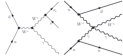 W玻色子与光子直接产生(左)和散射产生(右)的示意费曼图