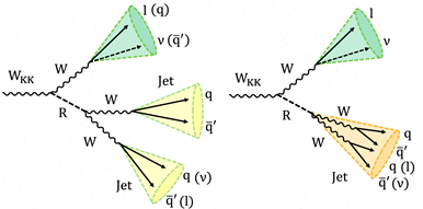 (左图为三个分离较开的W玻色子;右图为一个分离的W玻色子和两个合拢的W玻色子,其中后者形成复杂的3夸克和4夸克喷注。)
