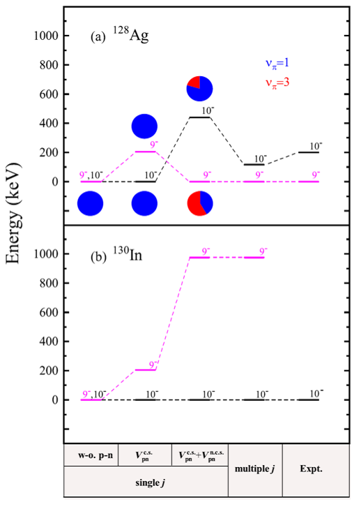 近期,北京大学物理学院技术物理系、核物理与核技术全国重点实验室的李智焕、华辉课题组和华东师范大学物理系的程奕源等合作者对奇奇丰中子核128Ag(Z=47,N=81)中的辛弱量子数(见图1)及其结构开展了研究。利用日本理化学研究所提供的放射性核束,首次在128Ag核中发现了具有辛弱结构的同核异能态,其衰变路径与邻近单幻偶偶核128Pd和130Cd中的结构非常相似(见图2)。对比邻近的同中子核130In,一个重要的发现是它们最低的9-和10-能级次序出现了反转(见图3)。联合研究团队利用壳模型对128Ag核中同核异能态的结构特性进行了研究。在不考虑质子Z=50和中子N=82跨壳激发的情况下,壳模型计算结果很好解释了实验观察到的128Ag核中同核异能态的结构和衰变路径。通过分析质子-中子相互作用的不同成分,发现同中子核128Ag 和130In中出现的9-和10-能级反转现象可以归因于质子-中子相互作用中辛弱不守恒的成分。研究有力支持了中子N=82主壳在银同位素中的稳健性。