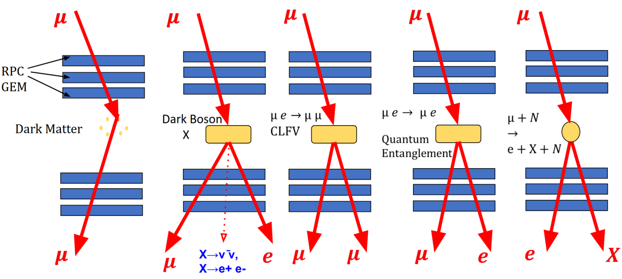 图:PKMuon实验物理目标概览,涵盖暗物质、暗玻色子、带电轻子味道破坏探测、量子纠缠及缪子-核子散射等方向