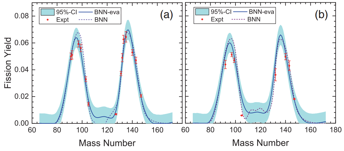 目前核裂变产物的实验测量很难给出完整的产物分布,只能结合模型评估给出完整的裂变产物分布。人们通常基于唯象模型、通过调参数来拟合出产物分布。该工作通过对已有裂变数据库的学习,当实验测量给出不完整的裂变数据时能够推断出完整的裂变产物分布。结果表明,随着中子能量增加,裂变模式逐渐从不对称裂变演化成对称裂变。这说明神经网络能成功抓住部分物理图像。当实验数点很少时,唯象评估模型失效,神经网络仍然可以给出有效的评估和合理的置信区间。贝叶斯神经网络对核裂变产物的评估开辟了一个新的方向,展现了机器学习的一个实际应用范例,将对核数据的定量评估产生重要影响,有望更好地提供应用级的精确核数据。