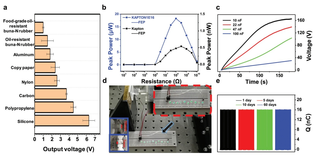 图2: 剂量为1×1016 ions/cm2的He离子辐照后的Kapton样品的电学特性:(a) 作为正极材料与常规的正极材料组合后的的电压Voc;(b) 峰值功率对电阻的依赖性;(c) 器件在不同电容时的充电电压曲线;(d) 与FEP材料组合后可以点亮十个LED灯;(e) 在60天内保持良好的稳定性。