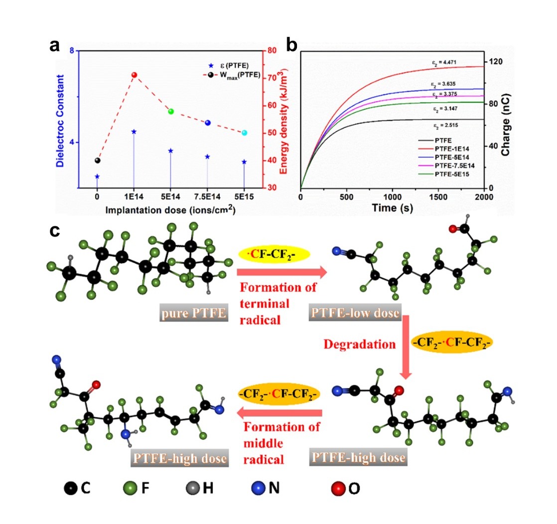 图2. 改性材料的介电性能和起电性能提升机制。不同离子注入剂量下的PTEF薄膜的介电性能:(a)PTFE薄膜的最大储能密度与介电性能的关系。(b)由介电常数极端的各注入剂量改性的PTFE薄膜的最大表面累积电荷 (Q) 。(c)N离子注入改性过程示意图:在低注入剂量下,链端形成不饱和键;在高剂量下形成链间的不饱和键和饱和键