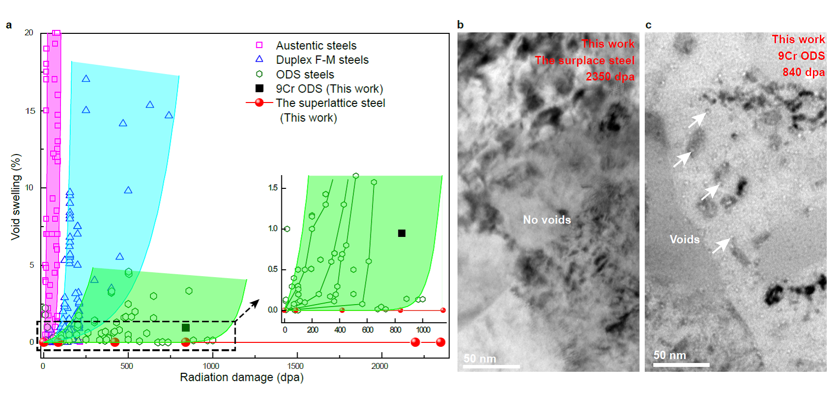 图1. 含高密度Ni(Al,Fe)纳米粒子的超晶格钢在离子辐照条件下的超高耐辐照性能。图b和c比较表明该超晶格钢具有很高的抗辐照肿胀性能