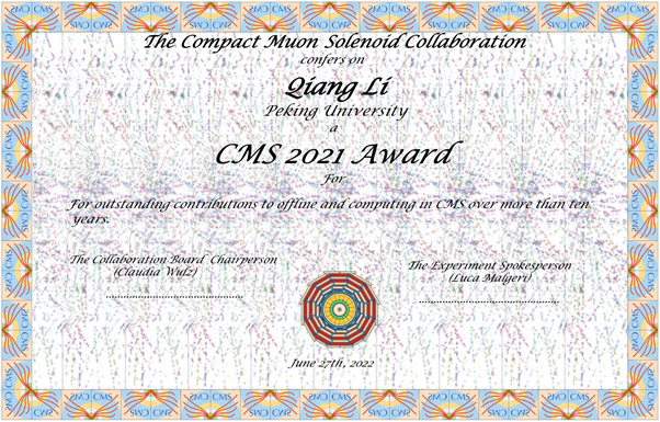 在2022年6月29日举办的CMS-Week会议上,北京大学物理学院高能物理组李强研究员以"在离线软件和计算领域的长期卓越贡献"(For outstanding contributions to offline and computing in CMS over more than then years),获颁CMS实验组2021年度奖。李强曾于2018年9月至2020年8月担任CMS物理产生子组二级召集人;2020年9月至2022年8月担任CMS计算组二级召集人。