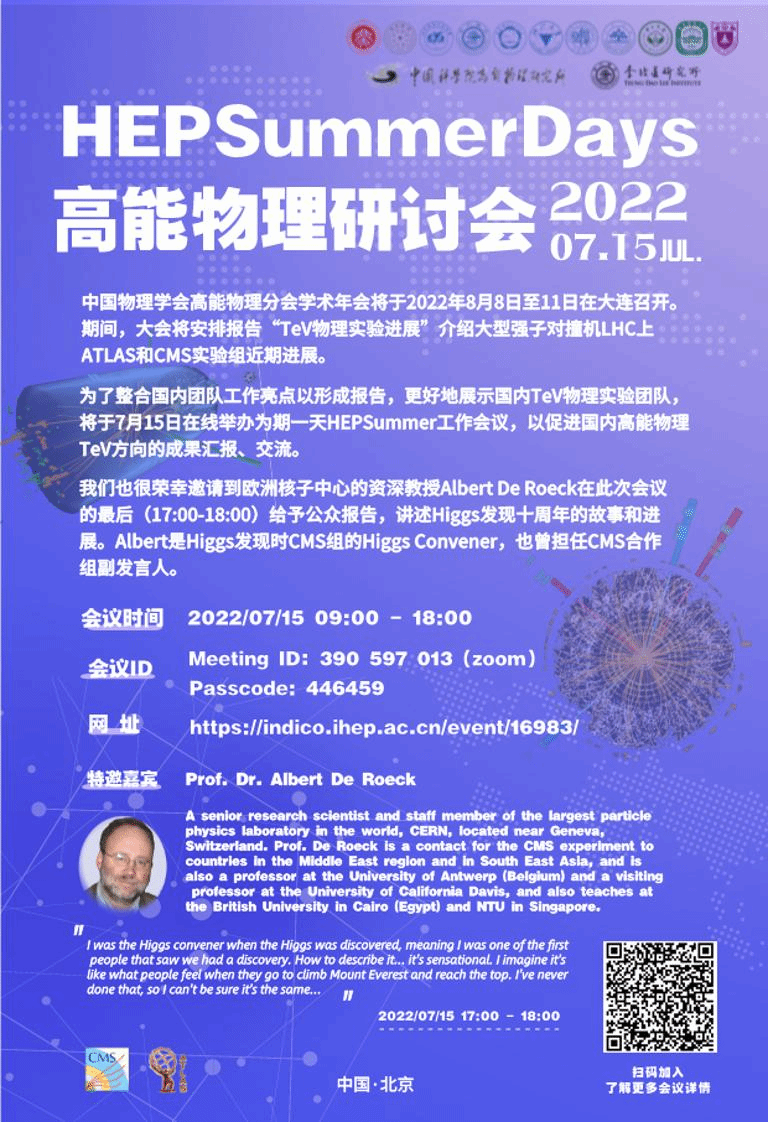 2022年7月15日,高能量物理前沿学术研讨会暨大型强子对撞机ATLAS及CMS中国组学术交流研讨会通过在线方式成功举办(https://indico.ihep.ac.cn/event/16983)。