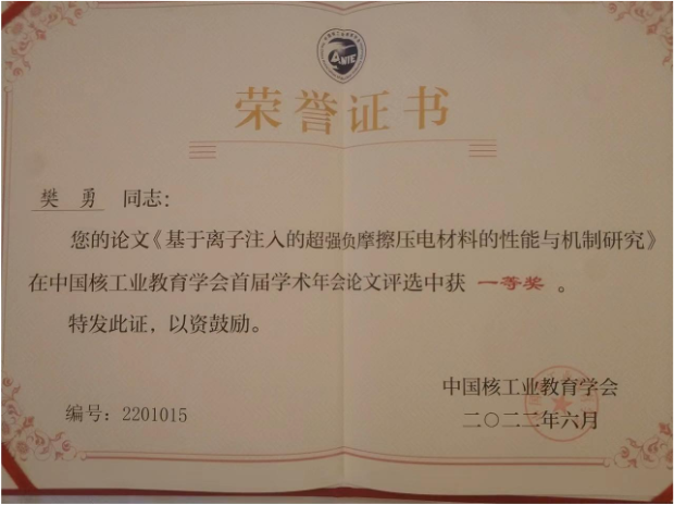 北京大学物理学院技术物理系付恩刚教授课题组2017级博士生樊勇的论文《基于离子注入的超强负摩擦压电材料的性能与机制研究》在大会评奖中获得一等奖,该论文报道了离子束改性摩擦起电材料的最新研究进展,阐述了分子极性与宏观电学性质之间的基本关系,研究结论可为未来高效摩擦起电器件的研究提供指导。樊勇于6月28日下午在大会进行口头报告展示了相关研究成果,获得与会专家的一致肯定。同时,北京大学获得了首届学术年会优秀组织奖。