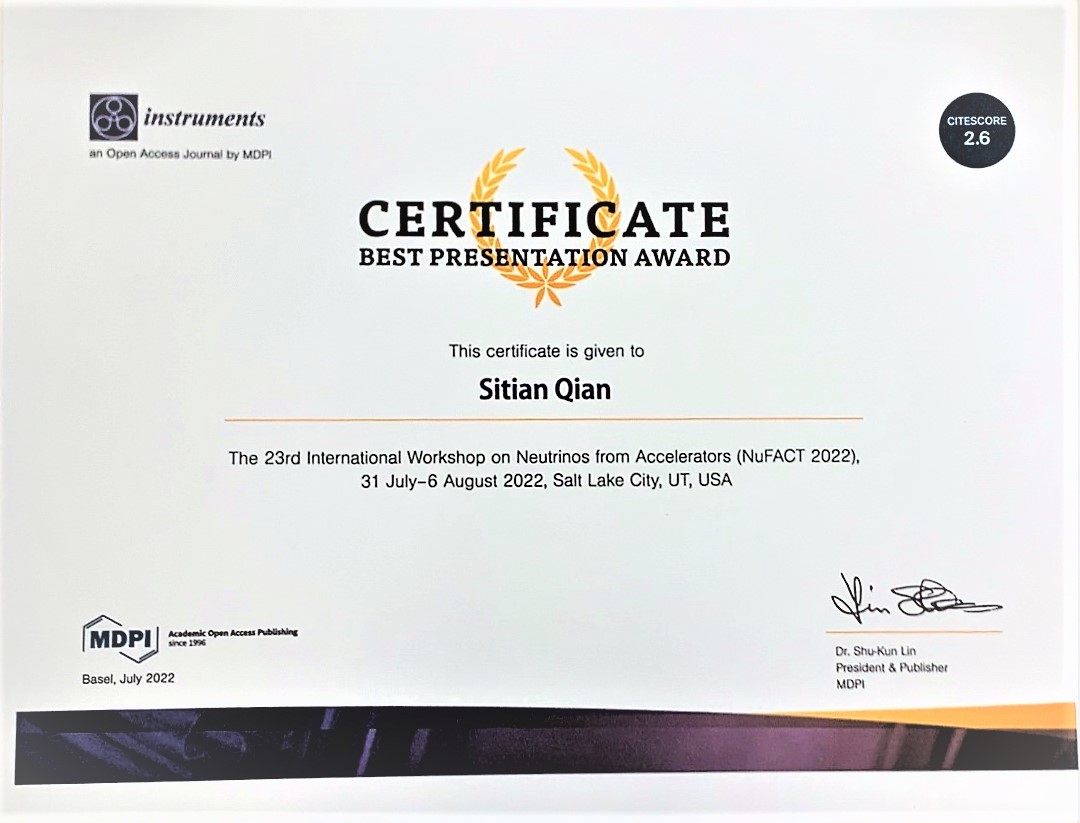 高能物理CMS组博士生钱思天获得第23届国际中微子工厂研讨会最佳报告奖