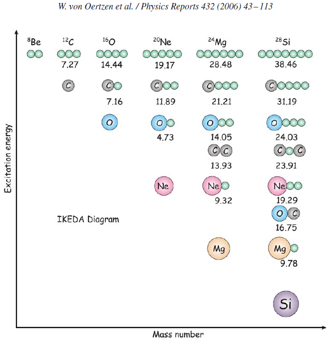 集团结构是在原子核低密度区普遍出现的奇特状态,近年来受到理论和实验的广泛关注。按照𝛼共轭核的Ikeda图(见图1),𝛼集团结构容易出现在对应的集团分离阈值附近。随着激发能的提高,可以出现多𝛼结构直至最高阶的全𝛼结构。如果所有𝛼粒子均处于S轨道且体系的整体空间分布扩展,则原本以费米子(核子)独立运动为基础的核体系可转化为以玻色子运动为基础的BEC状态。这种演化体现了量子多体结构的奥妙,对核物质形态和核天体过程有重要影响。此前的实验和理论研究基本确认, 天体演化过程中影响巨大的12C的Hoyle态(7.65 MeV的激发态)是由3-α组成的类BEC状态,它主要通过α+8Be→3α衰变。比12C重的体系里,由于实验直接测量多个α且判断它们所处状态确实很困难,这种状态是否存在迄今缺乏可靠的实验证据。
