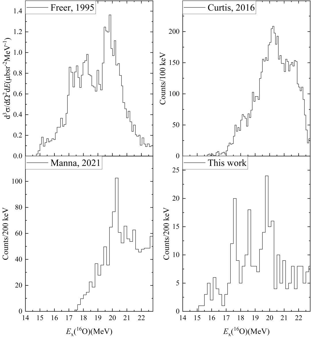 叶沿林课题组与合作者使用96 MeV的16O轰击12C靶, 非弹激发16O至4α破裂阈之上。通过多套基于硅微条探测器的粒子望远镜系统,首次实现了对16O高激发态衰变的4个α的准确识别和不同衰变道的区分,从而保证了高显著度共振态的发现(见图2中的This work)。对于本实验探测到的部分4-α事件,可判断其中3个α已经处于S轨道(构建了Hoyle态);而第4个α可处于不同轨道,对应于几个高显著度的16O共振态。按现有理论,这几个共振态中,包含了第4个α也处于S轨道的情况(见图3),是16O中出现类BEC态的重要证据,值得理论和实验上的进一步关注和确认。