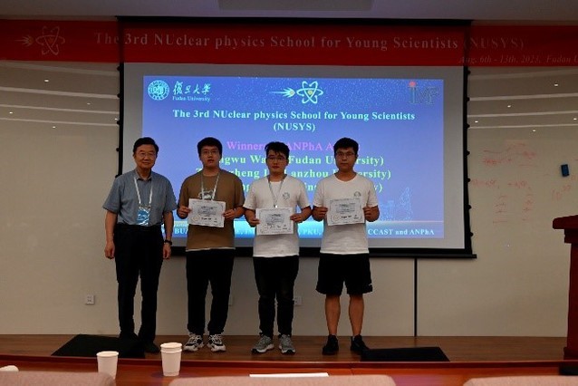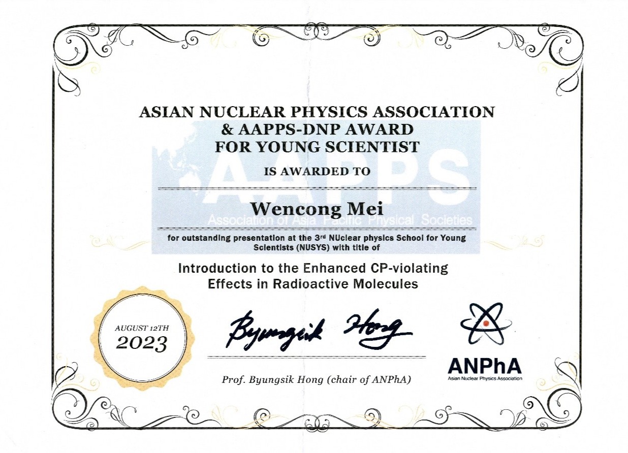 2023年8月12日,在第三届核物理青年科学家学校(NUclear physics School for Young Scientists, NUSYS)的闭幕式上,北京大学物理学院技术物理系、核物理与核技术国家重点实验室激光核谱与核性质课题组本科生梅文聪(导师为杨晓菲研究员)因在NUSYS上的报告“Introduction to the Enhanced CP-violating Effects in Radioactive Molecules”,获得亚洲核物理联合会(Asian Nuclear Physics Association,ANPhA)青年科学家优秀报告奖。同时获此奖项的还有复旦大学的王从武博士和兰州大学的李征征博士。