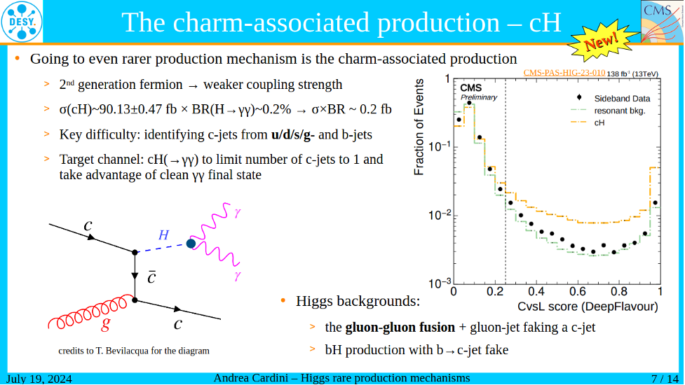周辰、李强、班勇团队主导完成了希格斯玻色子与粲夸克联合产生的首次寻找(https://cds.cern.ch/record/2905239)。这个产生模式是测量希格斯玻色子与第二代费米子相互作用的一种新途径。在CMS实验的数据分析中,希格斯玻色子与粲夸克联合产生过程的观测信号强度上限为标准模型预言的243倍。周辰研究员担任该分析的负责人,博士研究生张轩豪做该分析的预审核报告,并被CMS实验的物理简报(https://cms.cern/news/using-charm-study-higgs-boson)采访。