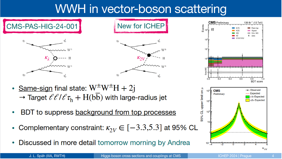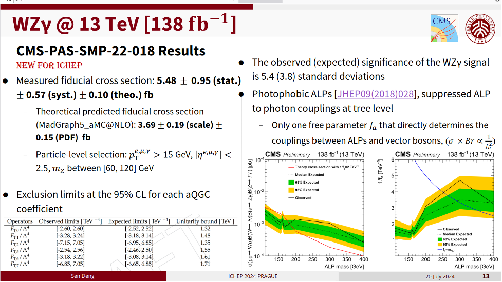 北京大学高能物理CMS实验组近期取得了一批重要进展:主导完成了希格斯玻色子与粲夸克联合产生的首次寻找、主导完成WZγ 过程的观测、主导完成VBS W±W±H过程的首次探测、为CMS实验13.6TeV质心能量下希格斯玻色子产生截面的首次测量做出贡献。这些工作在两年一度的国际高能物理大会(ICHEP 2024)上作为对撞机物理的亮点得到展示。