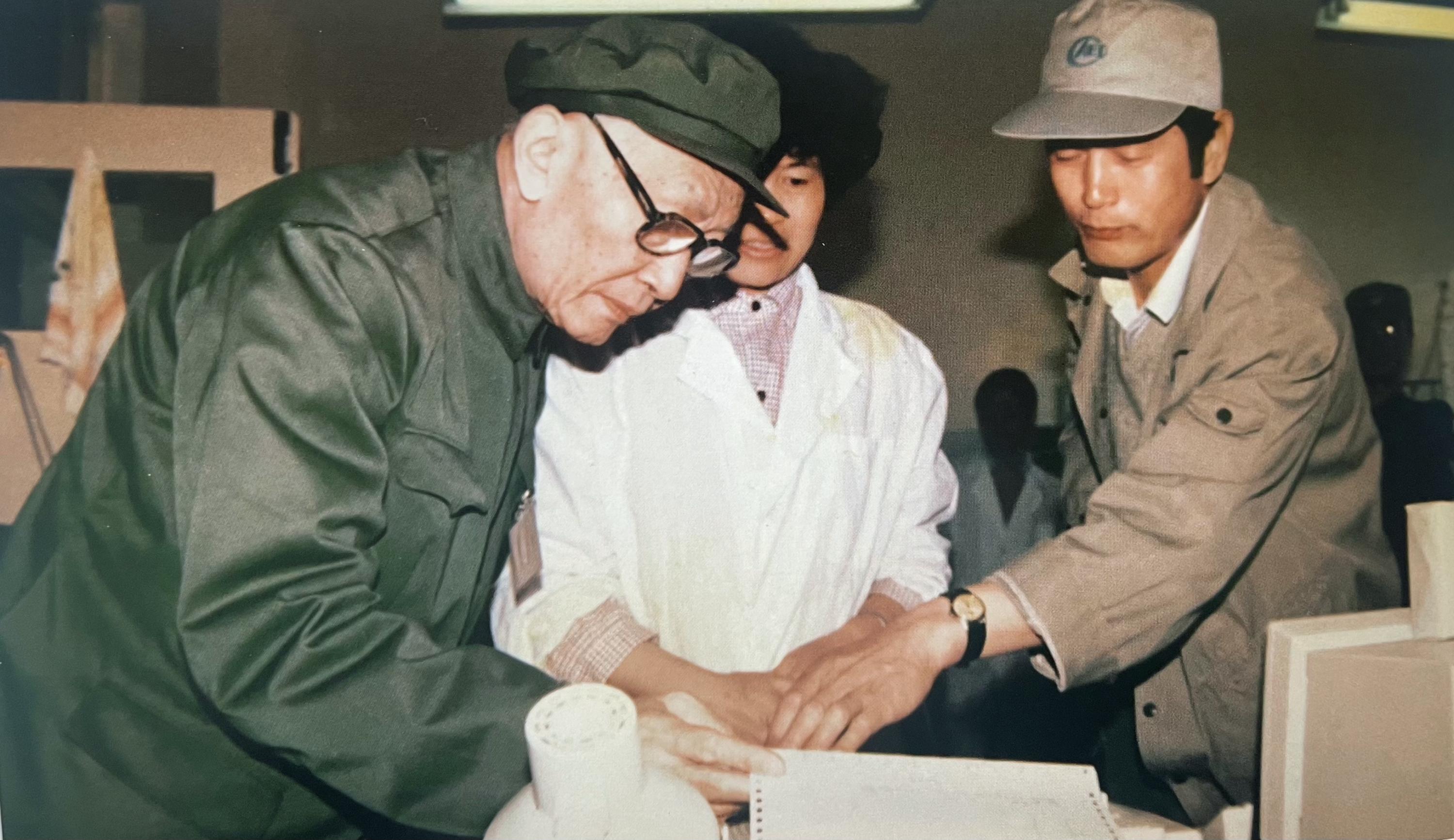 朱光亚(左)在中国工程物理研究院某研究所视察、指导工作