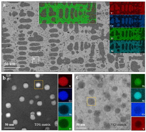 图1:双相V34Ti25Cr10Ni30Pd1合金的微观形貌 (a) SEM 表面形貌和相应的 EDS能谱,显示该合金呈富VCr相和富TiNi相组成的典型二相结构;(b) TiNi相的TEM图像及其纳米沉淀物的EDS能谱,表明存在大量 VCr 纳米析出相;(c) VCr相的TEM图像及其纳米析出相的EDS能谱,揭示了大量的 TiNi 纳米析出相
